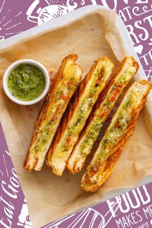 מוציאים 3 קוביות שום חריף דורות ו-3 קוביות כוסברה דורות לקערה גדולה. מוסיפים 2 כפות שמן זית ומערבבים.